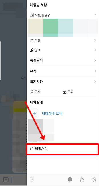 오른편에서 새창이 밀려서나올텐데요. 맨밑을 보시면 비밀채팅이 있습니다. 여기서 잠깐 비밀채팅을 알아보자면 대화내용을 숨겨줄뿐만 아니라 카카오톡 본사에서도 대화내용을 알수없게 나와 대화를 나누는사람만이 열 수 있는 암호코드가 설정된다고 합니다. 그래서 비밀채팅방에서 대화를 나누면 누구한테도 노출이 되지 않는다고 하네요.