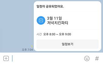 보내기를 하시면 이제 채팅방에 일정이 공유됩니다. 이렇게 보내진 것은 말을 하거나 사진을 올리면 위로 올라가버리게 되니깐 일정을 확인하는데 큰 의미는 없습니다. 그렇기에 카카오톡 캘린더를 별도로 확인하는 방법을 알고 계셔야 합니다.