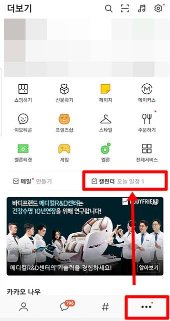 카카오톡 하단 메뉴의 최우측에 있는 점 3개 버튼을 눌러줍니다. 그 후에 살펴보시면 캘린더 오늘 일정이라는 메뉴가 또 보일겁니다. 이곳이 바로 전체 채팅방 일정과 나만 볼 수 있는 개인 계획을 보여주는 달력입니다.