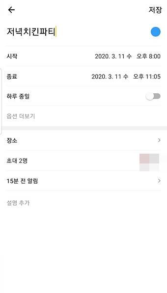 이곳에서 이전 간이화면에서 했던 정보외에도 장소와 초대 인원추가 알림시간을 바꿔줄수있습니다. 제가 개인적으로 카카오톡 캘린더를 이용해본 결과 만나는 약속을 정하는 경우가 많은데 이럴때에는 알림을 최소한 1시간 이전에는 해줘야 도움을 받을 수 있습니다. 처음에는 기본적으로 15분 전 알림으로 되어있는데 온라인에서 게임을 하는 것이 아니라면 넉넉하게 설정하시길 바랍니다. 약속 ~시간전에 알림으로 톡이 오게되며 까먹지 않고 준비를 할 수 있게 됩니다.