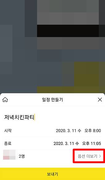일정에서 맨위에서는 제목을 만들어주시고 일정의 시작일과 종료일의 날짜와 시간을 설정해주시면 됩니다. 혹시 현재 톡방에 있는 인원뿐만 아니라 다른 사람을 추가하고 싶다던지 장소같은 상세한 정보를 넣어주고 싶으시다면 보내기를 누르기전에 옵션 더보기 메뉴를 클릭해서 들어가줍니다.