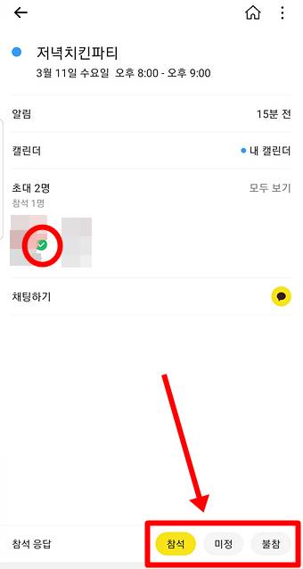 일정의 정보가 자세히 나오게 되는데 초대인원 프로필 우측 하단을 보시면 마크가 보일겁니다. 이것으로 약속에 참여할 인원을 특정지을 수 있는데요. 이 마크는 아래를 보시면 참석/미정/불참으로 내 상태를 표시할 수 있습니다. 미정의 경우 물음표가 뜨는등 쉽게 모임주최자가 관리할 수 있습니다.