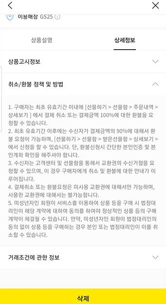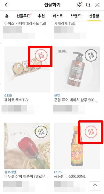 이렇게 기프티콘을 보면 유효기간이 이미 지났던 것들은 환불을 받아주셔야 합니다. 더 이상 사용은 불가능하기 때문에 현금으로 돌려받는 것이죠. 저의 경우 사용내역을 살펴보면 취소환불 마크가 표시된 것이 있는데 전부 계좌로 현금 환불을 받은 내역들입니다. 그렇다면 환불규정과 방법을 알아보아야겠죠.