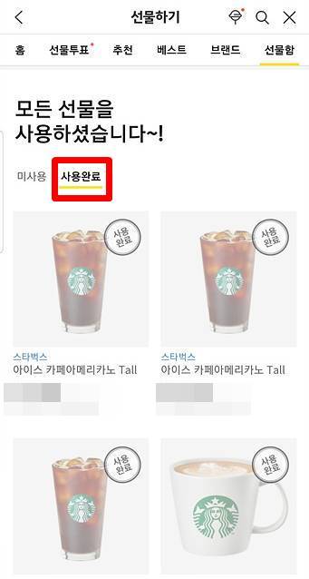 이제 카카오톡 선물함에서 사용완료부분을 살펴보도록 하겠습니다. 여기서는 이미 이용이 완료된 기프티콘이 모아져있는 곳인데요. 이미 사용한 내역들이 있고 클릭하면 상세한 정보가 보여집니다. 누가 예전에 보냈었는지와 또 기프티콘과 함께 받았던 편지를 이곳에서 다시한번 확인할 수 있습니다. 저같은 경우 여자친구가 많이 보내줬었던 기프티콘의 편지들을 이곳에서 자주 읽고는 합니다.