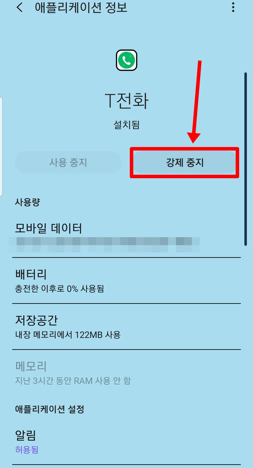 앱 정보에서 강제중지를 눌러줍니다. 이것을 해주는 이유는 숨기기를 통해 갤럭시 기본어플 삭제를 진행하기에 앞서서 보이지 않는 기본앱들이 데이터를 통해 업데이트를 하거나 백그라운드에서 몰래 돌아가는 것을 방지하기 위한 과정입니다. 강제중지를 하면 이제 앱을 눌러서 실행하지 않는 이상 다시 가동하지 않게 되기 때문이죠.