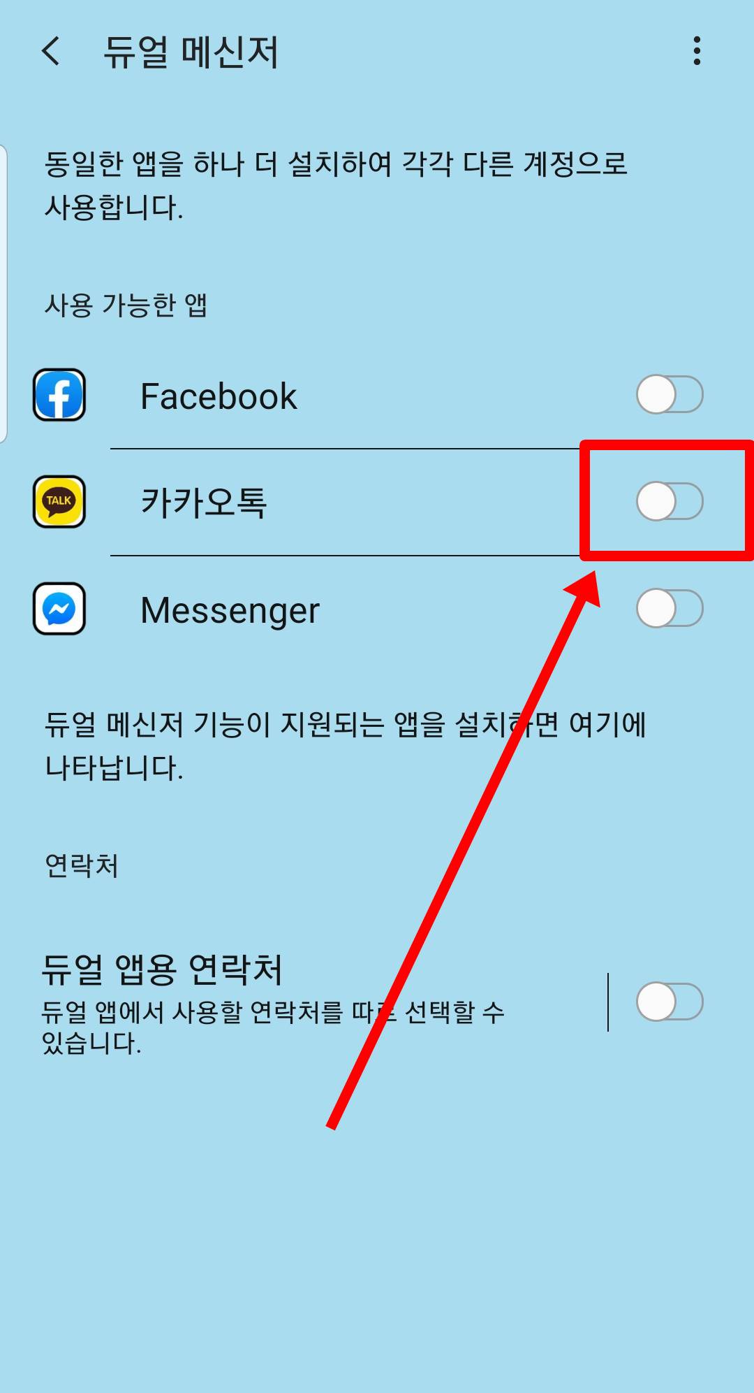 들어가보면 스마트폰에 설치된 메신저 기능인 페북, 카카오등만 보이는 것을 확인할 수 있습니다. 여기서 카카오톡의 오른쪽 바를 밀어서 활성화시켜주시면 서브용 앱이 생성됩니다. 무척 간단한 방법이지만 강력한 팁이 되겠습니다.