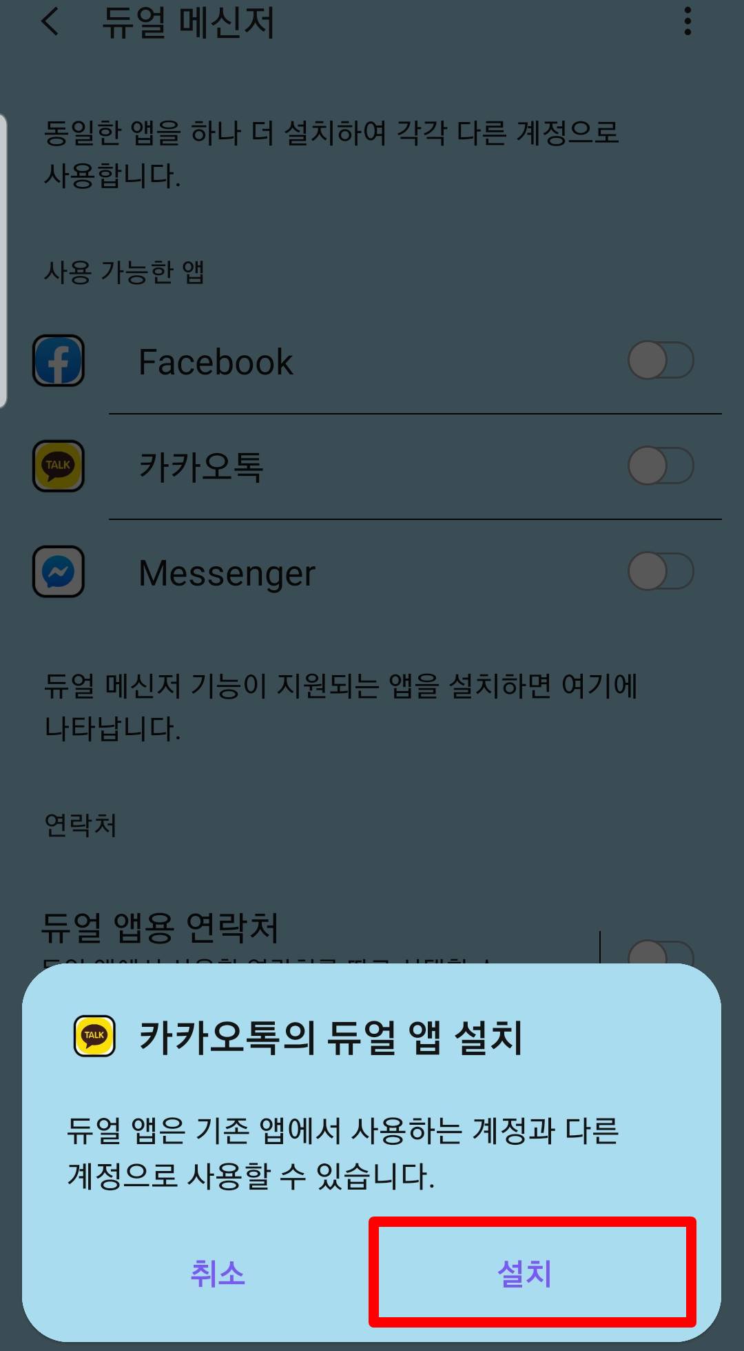 듀올 앱은 기존 앱에서 사용하는 계정과 다른 계정으로 사용할 수 있습니다 표시가 나오면 설치를 눌러주세요. 그러면 약 5초정도가 지나면 카피가 끝이납니다.