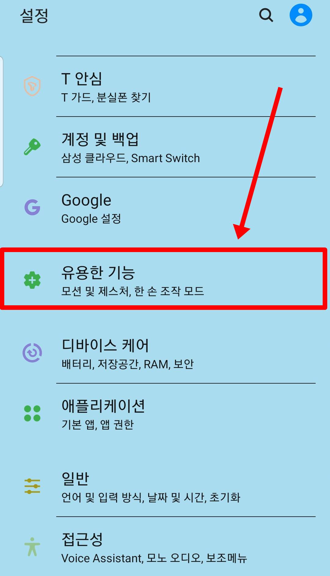 설정 앱을 켜주시고 유용한 기능 메뉴를 눌러주시길 바랍니다. 지금 과정은 카카오톡 계정 2개를 이용할 두개의 카카오톡 앱을 만드는 과정으로 스마트폰에서 공식적으로 지원하는 카피 복사 방법입니다.