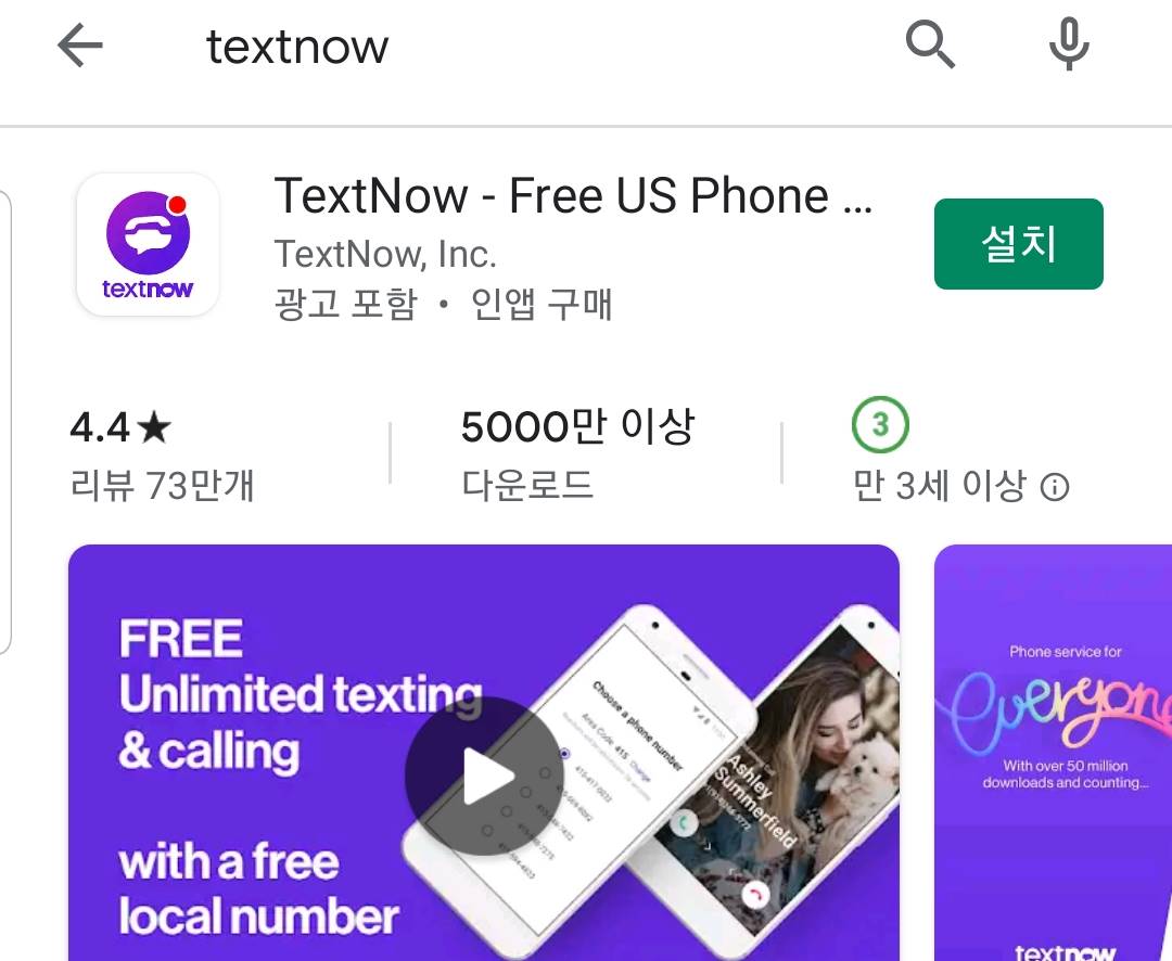 구글 플레이 스토어에서 textnow를 검색해주면 해외에서 만든 어플이 보입니다. 이 어플을 간략하게 소개드리자면 우리가 간단히 만드는 구글 계정을 연동해주기만 하면 해외의 번호를 아무런 절차를 거치지 않고 바로 개설을 해주게 됩니다. 전화용도로 만들어지는 것이 아니라 카카오톡 계정 두개를 생성하는 것처럼 문자인증을 간단하게 지원해주는 것으로 사용됩니다. 다운로드 받으신 후에 실행해주세요.