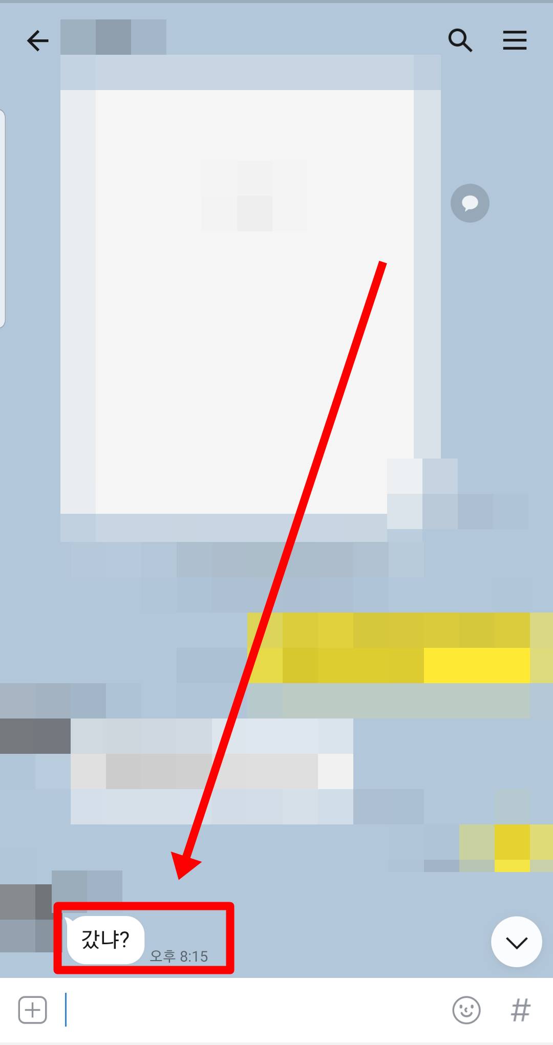 내가 답장을 보내고 싶은 상대방의 메시지를 찾습니다. 이미 대화가 상당히 지나서 위로 뭍혀버린 메시지여도 상관없습니다. 찾으셨다면 메시지를 손가락으로 2초간 꾸욱 눌러줍니다.