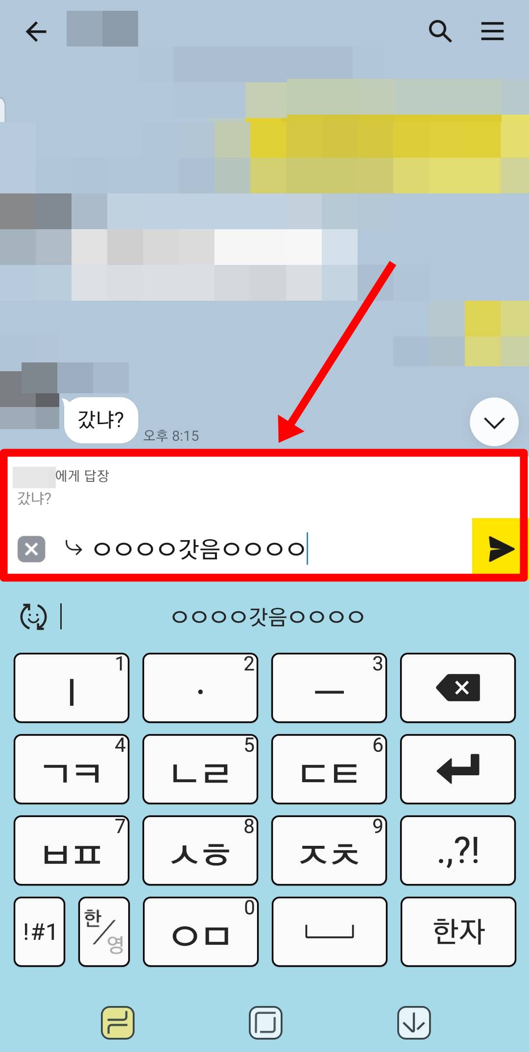 그러면 사진처럼 스마트폰 자판이 열리는데 기존의 채팅을 치던것과 한가지 차이가 있습니다. 입력창 맨 위에는 상대방의 글이 보이게 되는데요. 이것이 특정 메시지에 보낼 수 있는 카카오톡 답장기능입니다. 내용을 써주시고 보내기를 눌러줍시다.