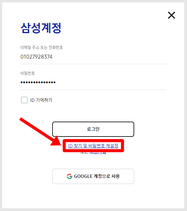 아이디는 이메일 주소 또는 전화번호인데 갤럭시를 개통했을 때 가입을 했다면 거의 대부분 본인 핸드폰번호로 되어 있을 겁니다. 010부터 끝번호까지 입력해주시면 되고 기억이 나는 비밀번호를 입력해서 로그인 하시면 되는데요. 잘 모르시겠다하시면 ID 찾기 및 비밀번호 재설정을 눌러서 찾아주시면 됩니다.