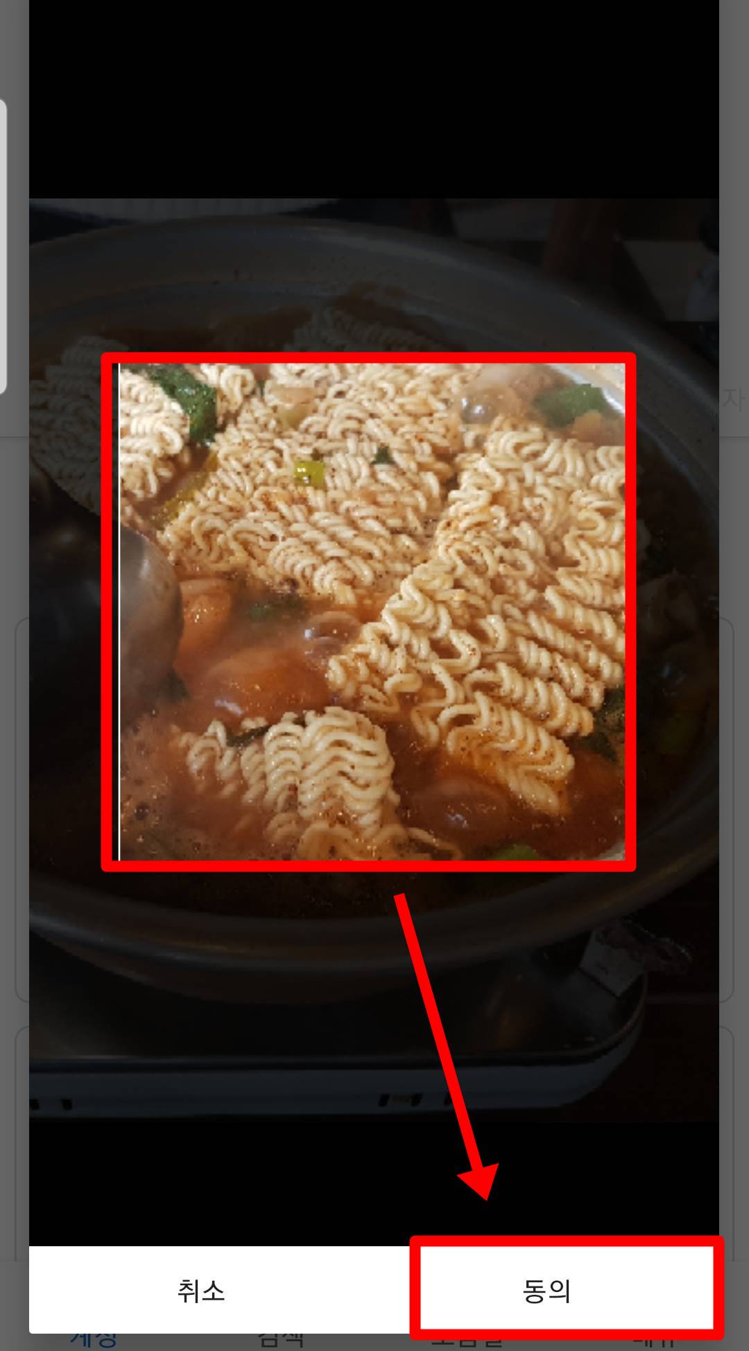 유튜브 프로필 사진 변경시 사진의 크기는 1:1 사이즈이기 때문에 정사각형의 박스가 보여집니다. 사진상에서 위치를 바꾸거나 사진을 확대, 축소로 내가 원하는 프로필 사진의 영역을 바꿀 수 있습니다. 저는 예시로 라면을 강조하고 싶어서 확대, 위치를 적절히 바꿔주었습니다. 모두 되셨다면 우측 하단 동의 버튼을 눌러주시면 적용이 완료됩니다.