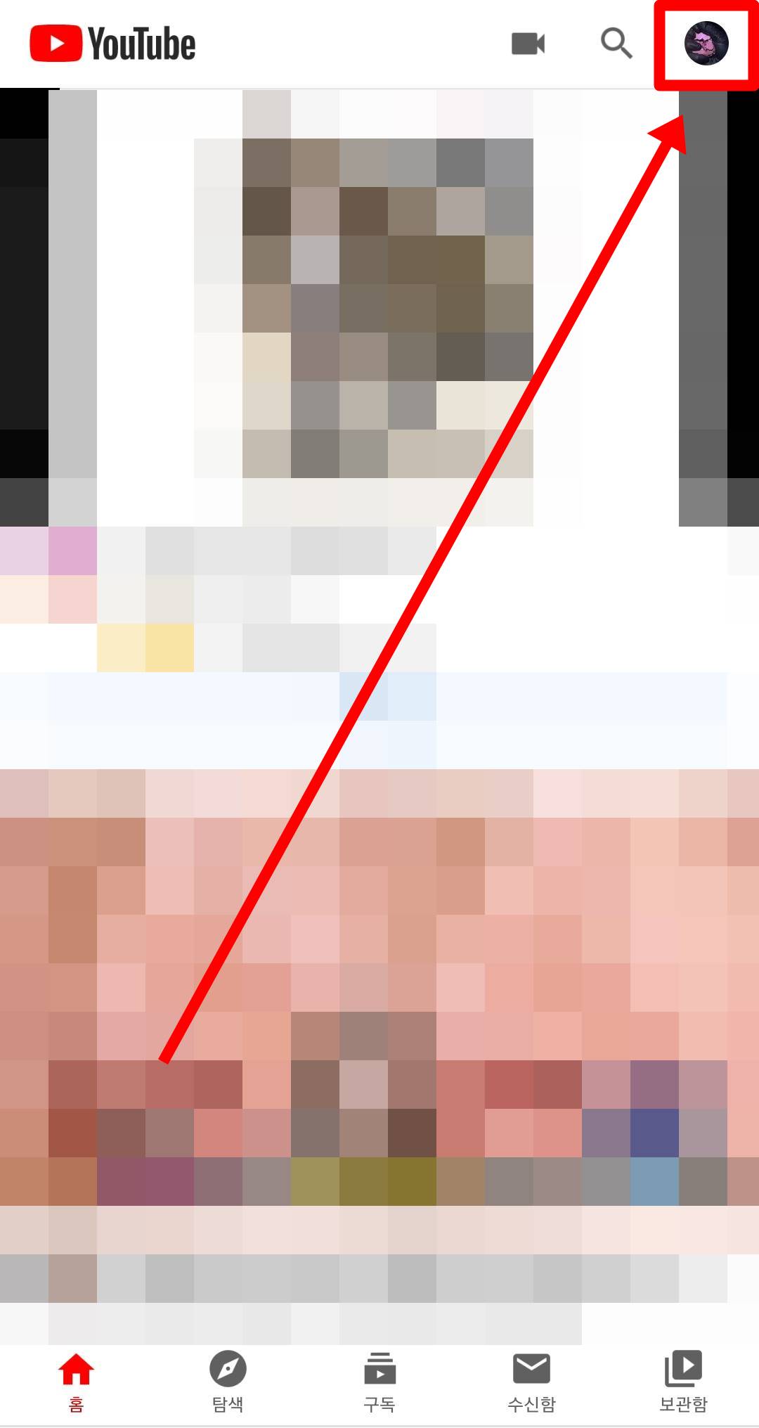유튜브 어플을 들어가면 로그인이 되어있을겁니다. 유튜브에서는 구글 계정을 사용하기 때문에 프로필이 연동되는데요. 우측 상단의 내 프로필 사진을 클릭해주시길 바랍니다.