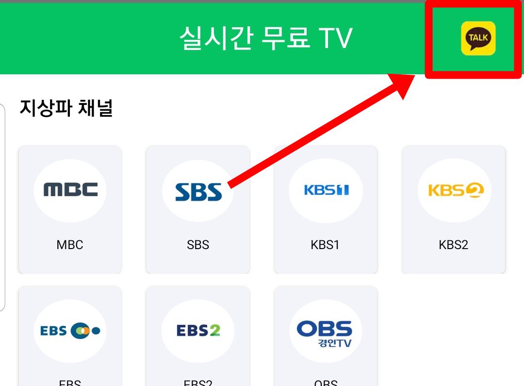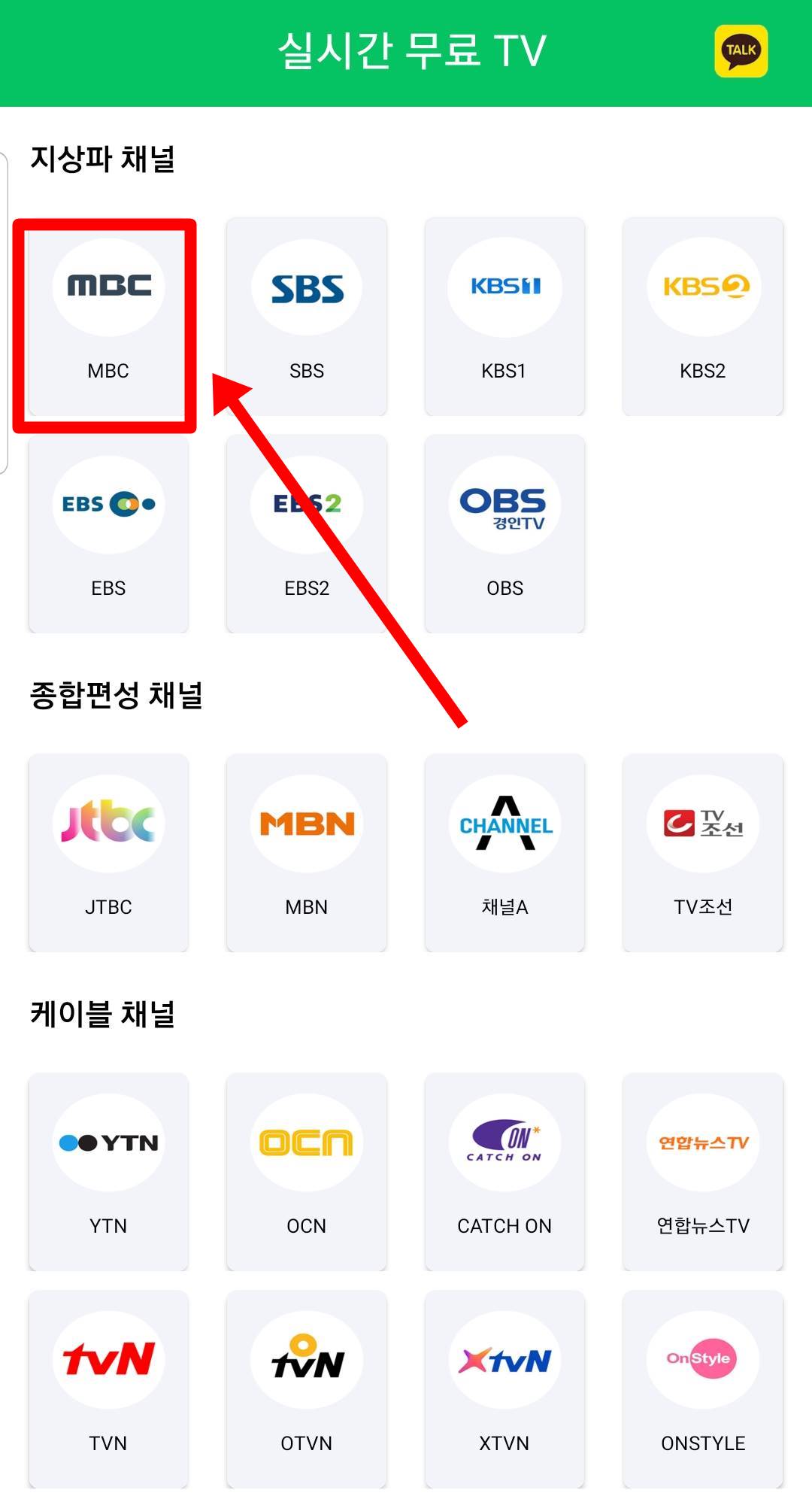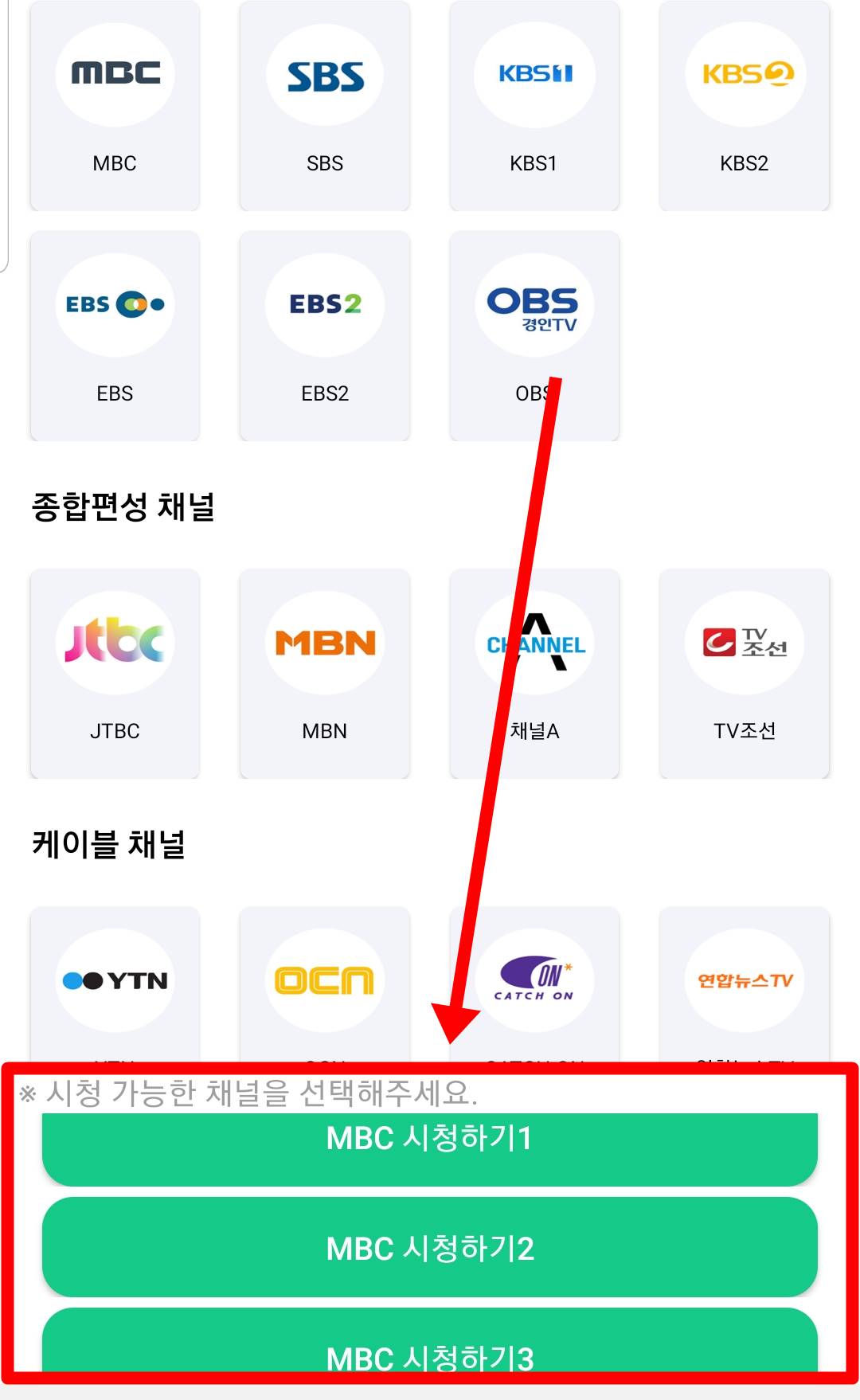 어플을 깔고 들어가보면 이렇게 심플하게 방송사들의 목록만 보여집니다. 다른 휴대폰으로 TV보기 앱들을 보면 광고가 덕지덕지 붙어있거나 작동도 되지 않는 메뉴들이 많은데요. 깔끔하게 TV에만 집중할 수 있는 것도 이 앱만의 장점이 되겠네요. 맨위에는 공중파 목록들이 있습니다. MBC, SBS, KBS, EBS, OBS가 대표적이죠. 보고 싶은 방송을 클릭해줍니다.