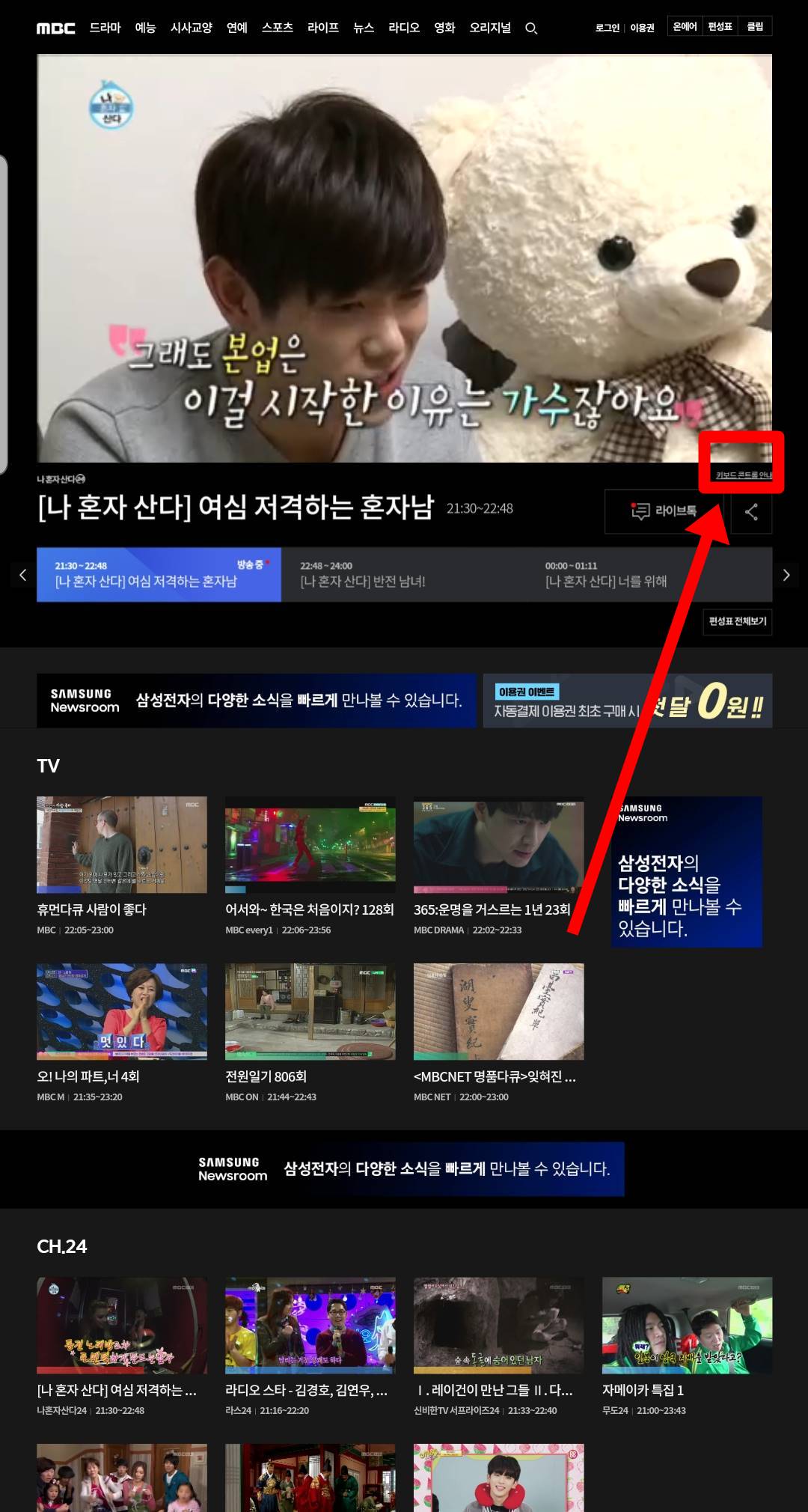 가끔 방송사를 클릭하면 사이트로 이동되면서 위의 사진처럼 보이는 경우가 있습니다. 이 경우에는 해당 방송사가 사이트로 누구나 볼 수 있게 무료로 오픈하여서 링크를 제공해주는 것인데요. 동일하게 화면의 우측 하단 전체화면 버튼을 클릭해주시고 휴대폰을 가로로 돌려주시면 문제 없이 시청이 가능합니다.