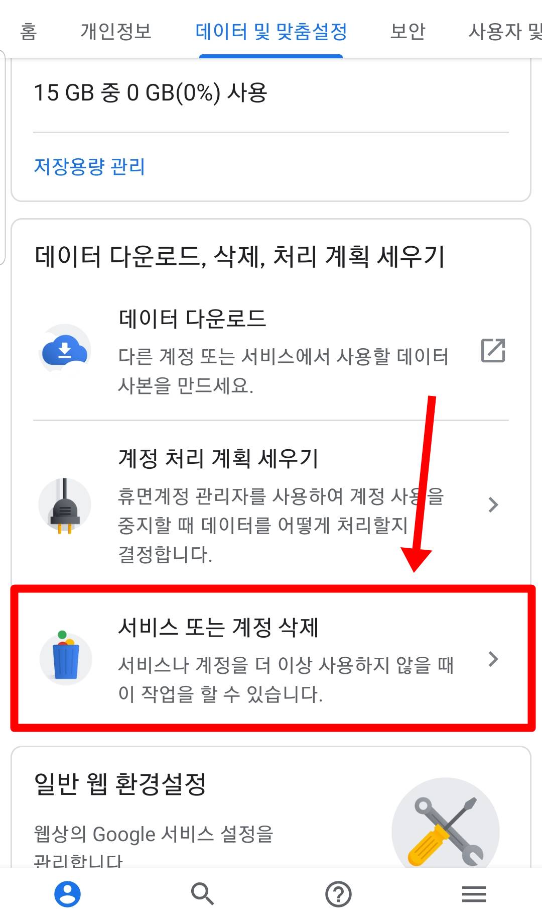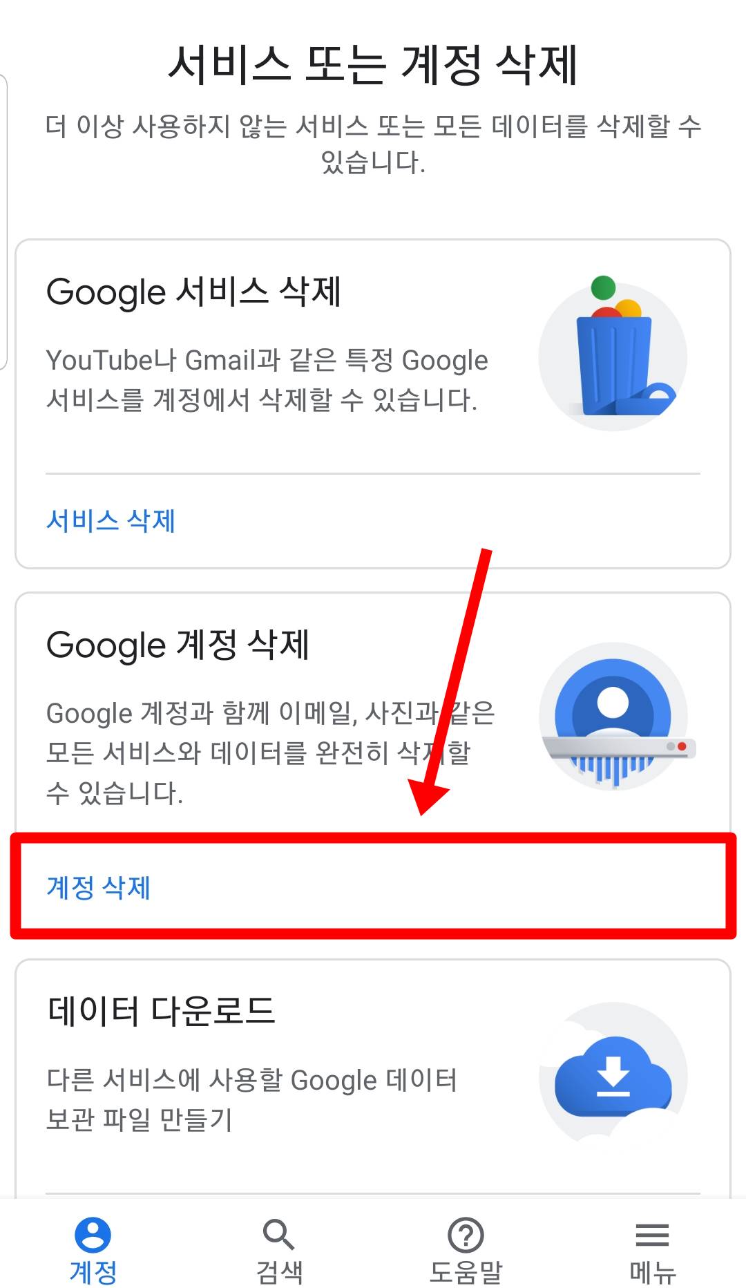 아래로 내려보시면 서비스 또는 계정 삭제가 있습니다. 이 메뉴는 서비스나 계정을 더 이상 사용하지 않을 때하는 작업이라는 설명이 덧붙혀져 있습니다.