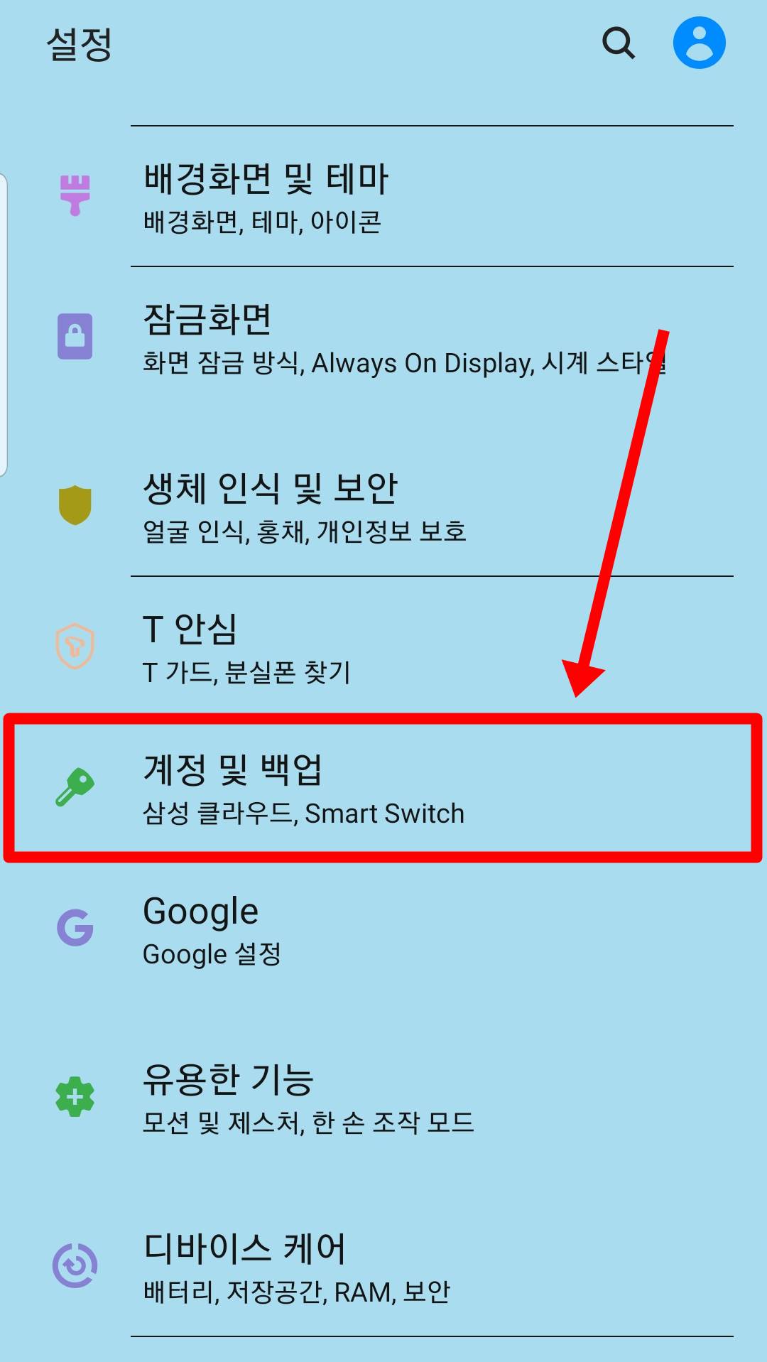 2. 아래로 내리셔서 계정 및 백업(삼성 클라우드, Smart Switch) 메뉴를 눌러줍니다.