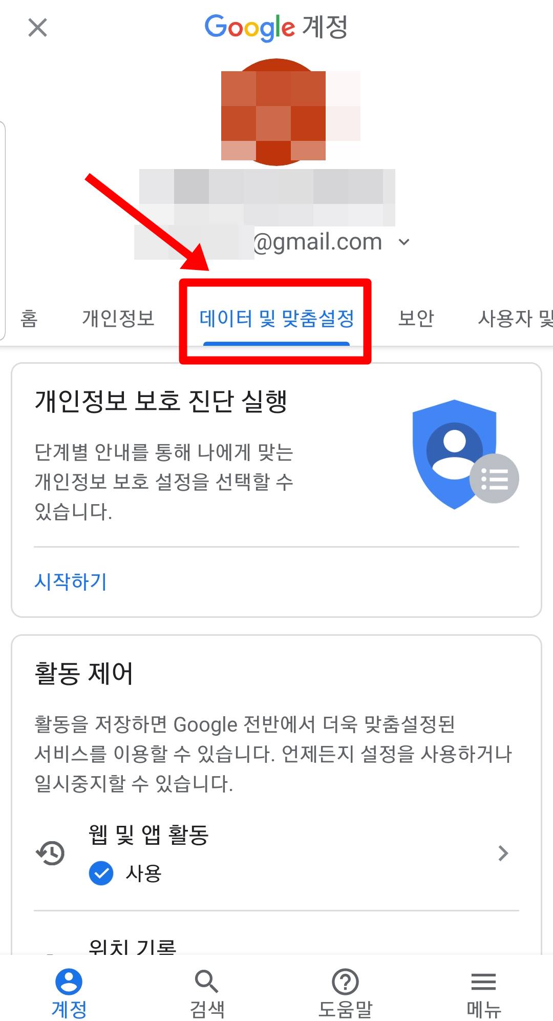 데이터 및 맞춤설정 메뉴를 눌러줍니다.