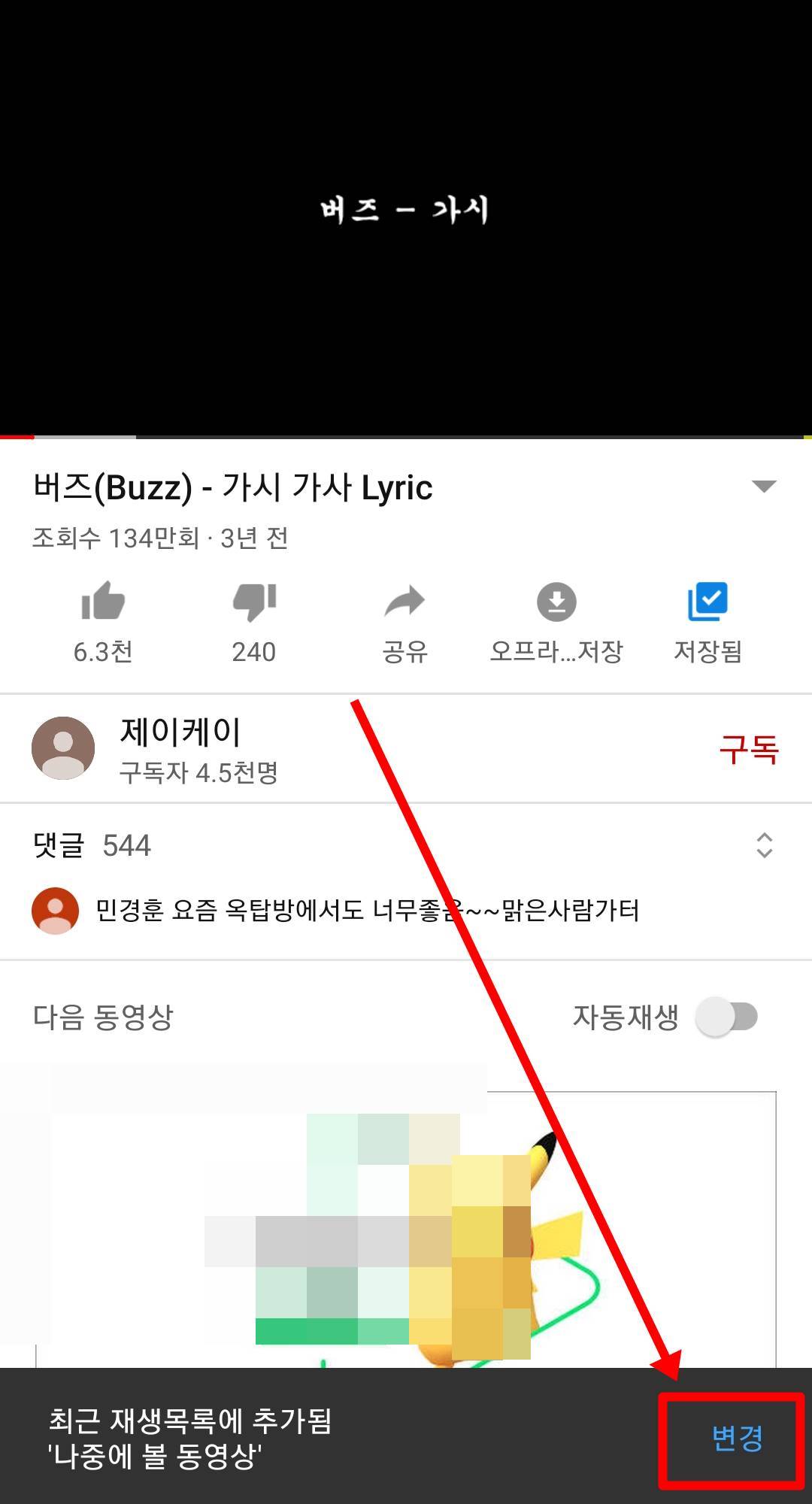 2. 스마트폰 화면 맨 끝에 최근 재생목록에 추가됨 "나중에 볼 동영상"이 나오는데요. 아무래도 반복재생으로 노래 동영상들을 모아주기 위해서 새로운 재생목록을 만드는 것을 추천드리고 싶습니다. 재생목록을 만들기 위해서 변경을 클릭합니다.
