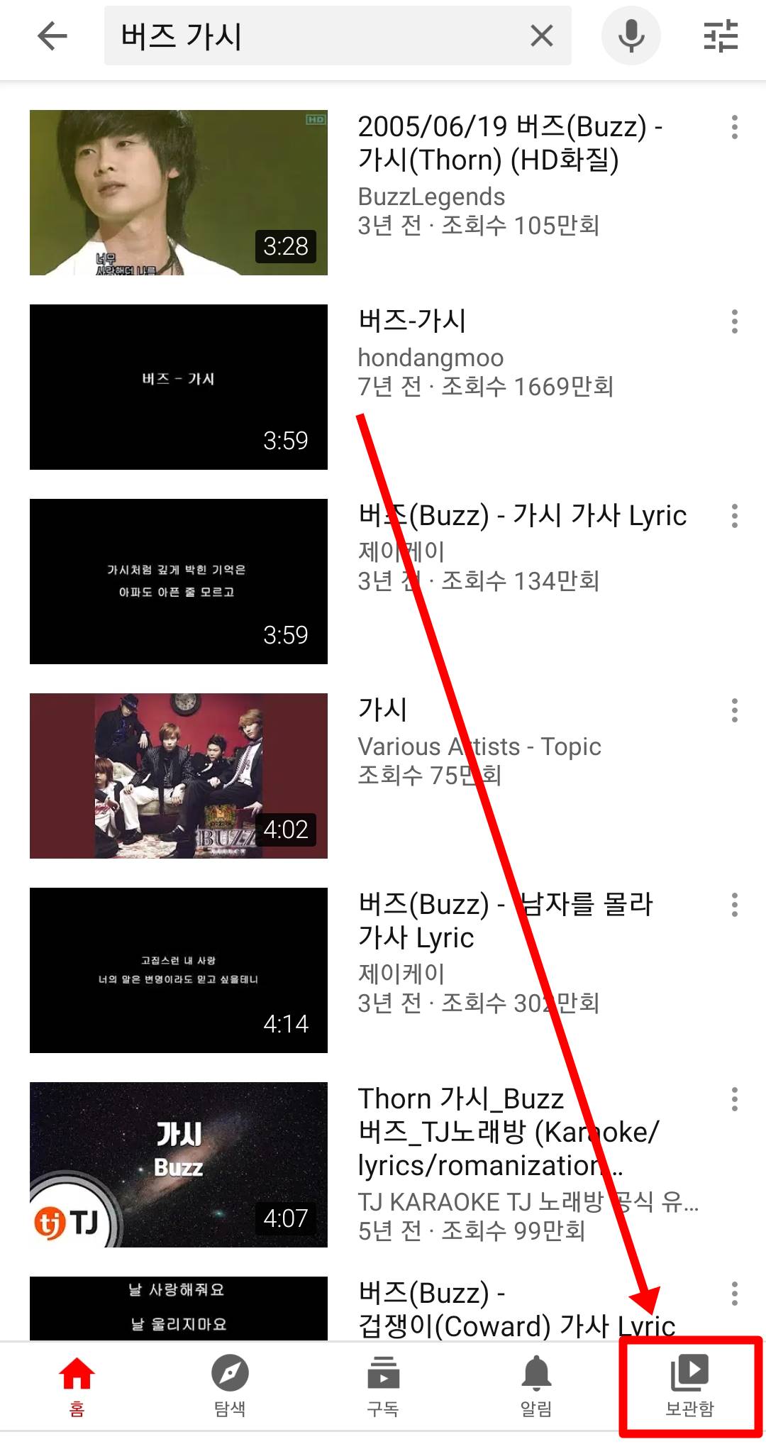 6. 이제 저장된 재생목록으로 들어가기 위해서 유튜브 메인 화면에서 우측 하단에 있는 보관함 버튼으로 들어가주시길 바랍니다.