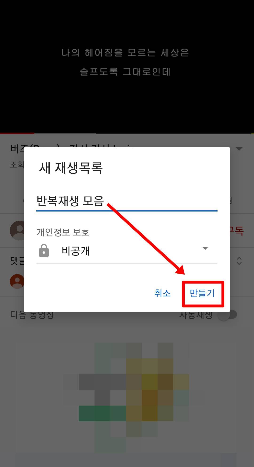 4. 새 재생목록의 제목을 설정해주시고 개인정보 보호를 위해서 비공개로 만들어주시는 것이 좋습니다. 저는 모바일 유튜브 반복재생 용도로 사용하기 위해서 한눈에 알아보기 쉽게 제목을 지어주었습니다. 모두 되셨다면 만들기를 클릭해주세요.
