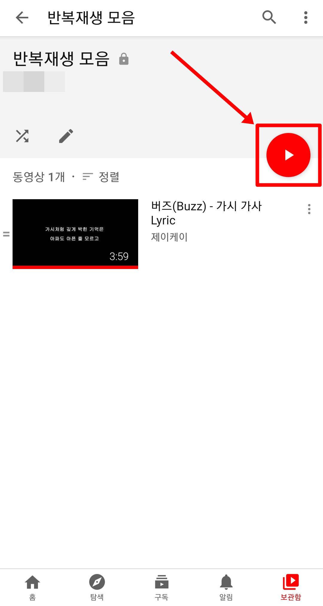 8. 모바일 유튜브 반복재생을 위해서 여러 개의 동영상들을 담아져있을텐데요. 우측 상단쪽에 있는 재생버튼을 눌러줍니다.