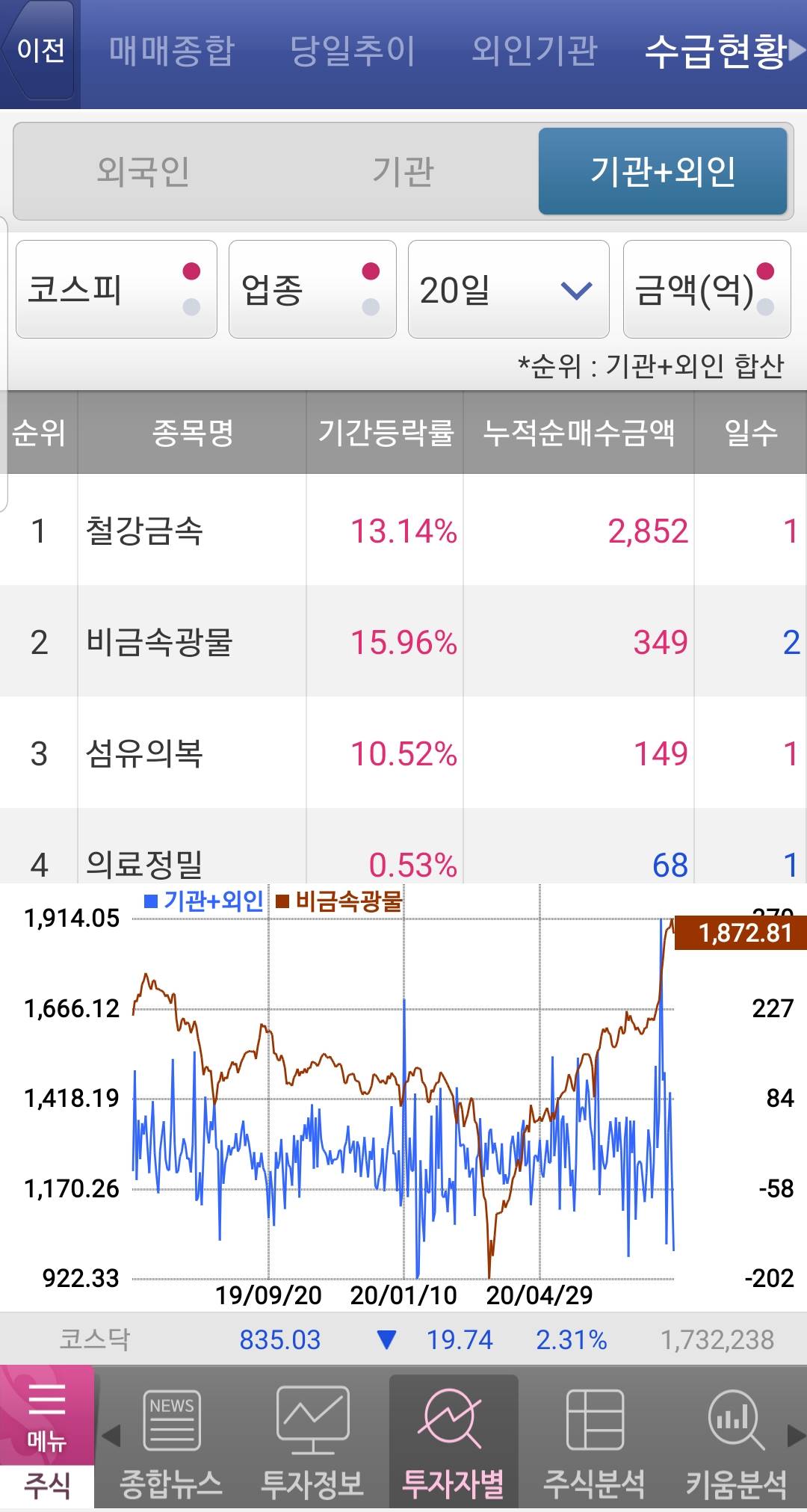 오르는 주식은 기관, 외국인, 개인들이 끝없이 매수하는 회사일 수 밖에 없다는 것은 이미 알고 계실 것입니다. 시장 원리상 매도보다 매수가 많을수록 가격은 오를 수 밖에 없기 때문이죠. 그래서 중요한 것이 수급을 분석하는 것입니다. 과거와 현재 매수세를 확인하여 특정 종목, 특정 섹터를 확인할 수 있는 것이죠. 키움증권에서는 수급분석에 대한 차트와 순위를 보여주기 때문에 반드시 설치해야 하는 주식 어플 추천에 포함시킬 수 밖에 없었습니다.