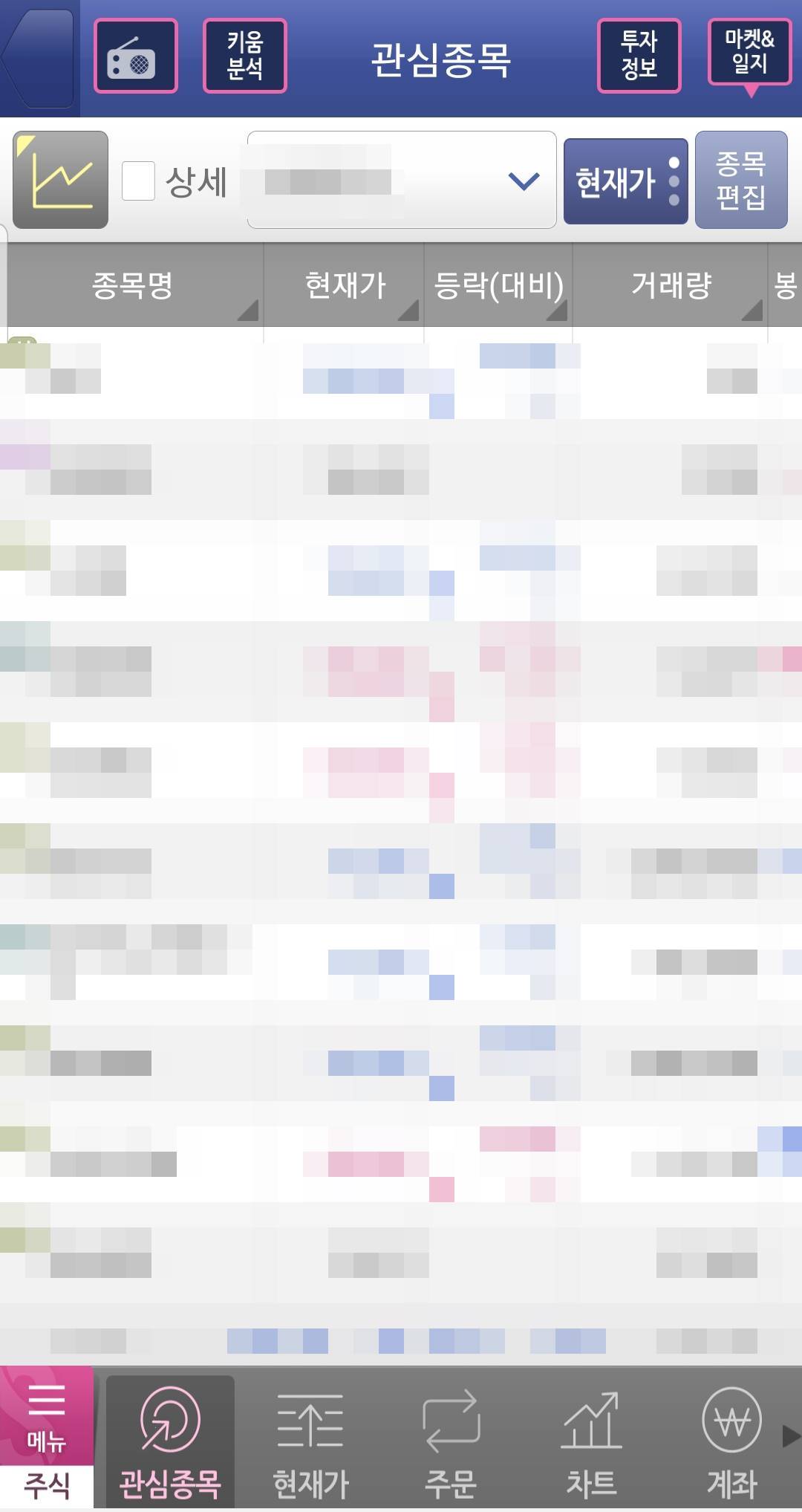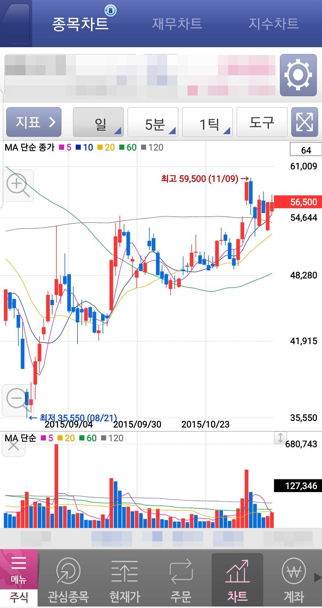 관심종목을 통해서 내가 투자하고 싶거나, 꾸준히 지켜보고 싶은 회사가 있다면 목록에 등록해서 쉽게 확인할 수 있습니다. 가격이나 차트를 보고 싶을 때 하나하나 검색을 하지 않아도 되어서 무척 편리하죠. 차트 메뉴에서는 일봉, 주봉, 년봉등과 거래량등을 볼 수 있고 주식 투자에서 사용하는 모든 지표들을 적용하여 볼 수 있습니다.