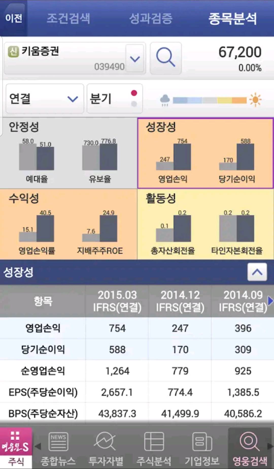 그 외에도 재무적 분석은 빠질 수 없는 투자 요소입니다. 내가 투자하고 싶은 회사의 종목분석 메뉴를 이용하시면 객관적으로 분석된 안정성, 성장성, 수익성, 활동성등을 볼 수 있고 재무제표까지 한 눈에 살펴볼 수 있는 강점이 있습니다. 주식을 투자할 때 차트만 확인하시는 분은 없을 것입니다. 수익을 많이 내는 회사일수록 내가 투자를 했을 때 손해를 보기보다 수익을 낼 확률이 높기 때문입니다. 재무분석이 어렵다고 느껴지신다면 영웅문 어플리케이션을 다운로드 받아서 이 메뉴를 활용 해보시는 것이 좋습니다.