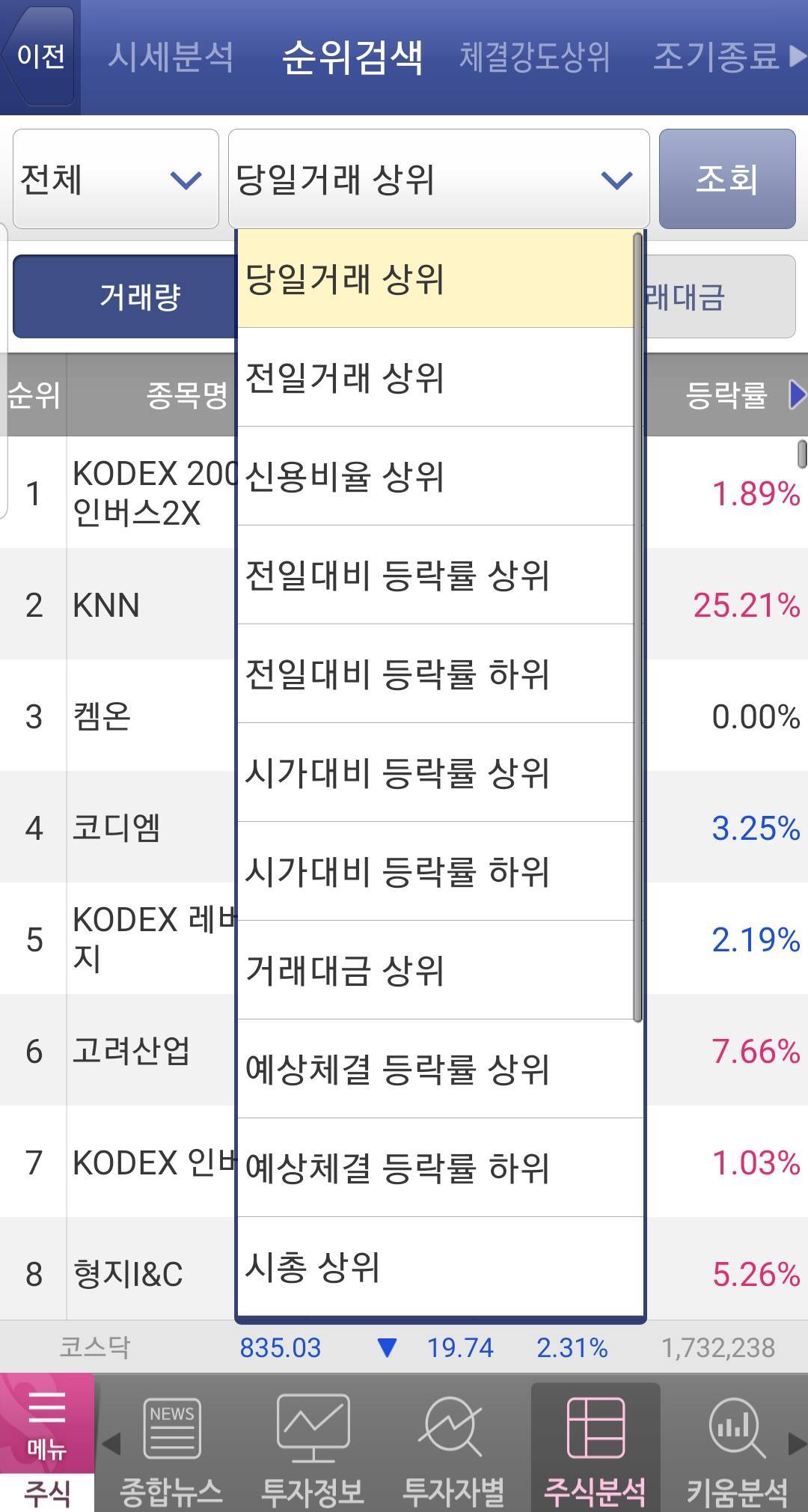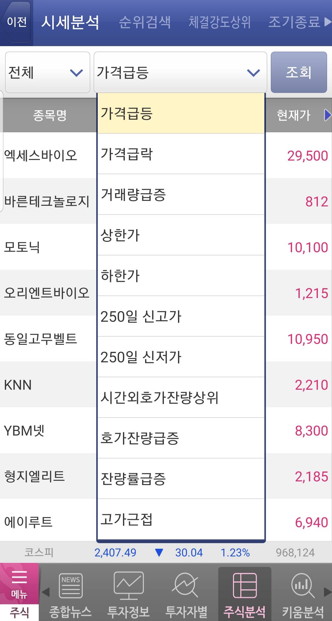 또 키움증권에서는 투자자들에게 투자할만한 회사를 쉽게 선택할 수 있게끔 다양한 순위, 자료들을 제공해줍니다. 현재 가격급등, 가격급락, 상한가, 하한가, 250일 신고가, 250일 신저가, 시간외호가잔량 상위, 호가잔량급증, 잔량률급증, 고가근접, 당일 거래 상위, 전일거래 상위, 신용비율 상위, 전일대비 등락률 하위, 시가대비 등락률 상위, 거래대금 상위, 예상체결 등락률 상위, 예상체결 등락률 하위, 시총상위 등의 기능으로 종목 목록을 볼 수 있습니다.