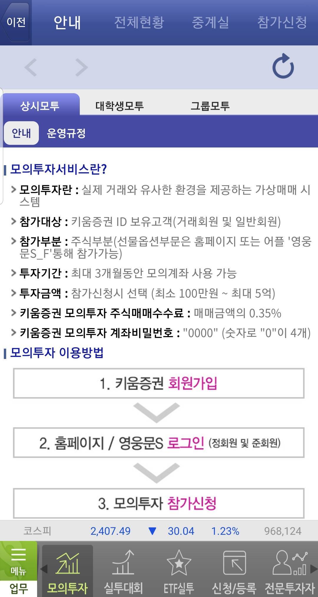 내가 가지고 있는 돈으로 잘 알지 못하는 주식 투자를 하기에는 두려움이 생길 수 밖에 없습니다. 이럴 때에는 실전투자와 동일하게 매매를 할 수 있는 모의투자를 사용하는 것이 좋은데요. 키움증권에서는 모의투자 기능으로 투자 금액을 설정한 뒤 매수, 매도를 하여 나의 실력을 객관적으로 파악할 수 있습니다.