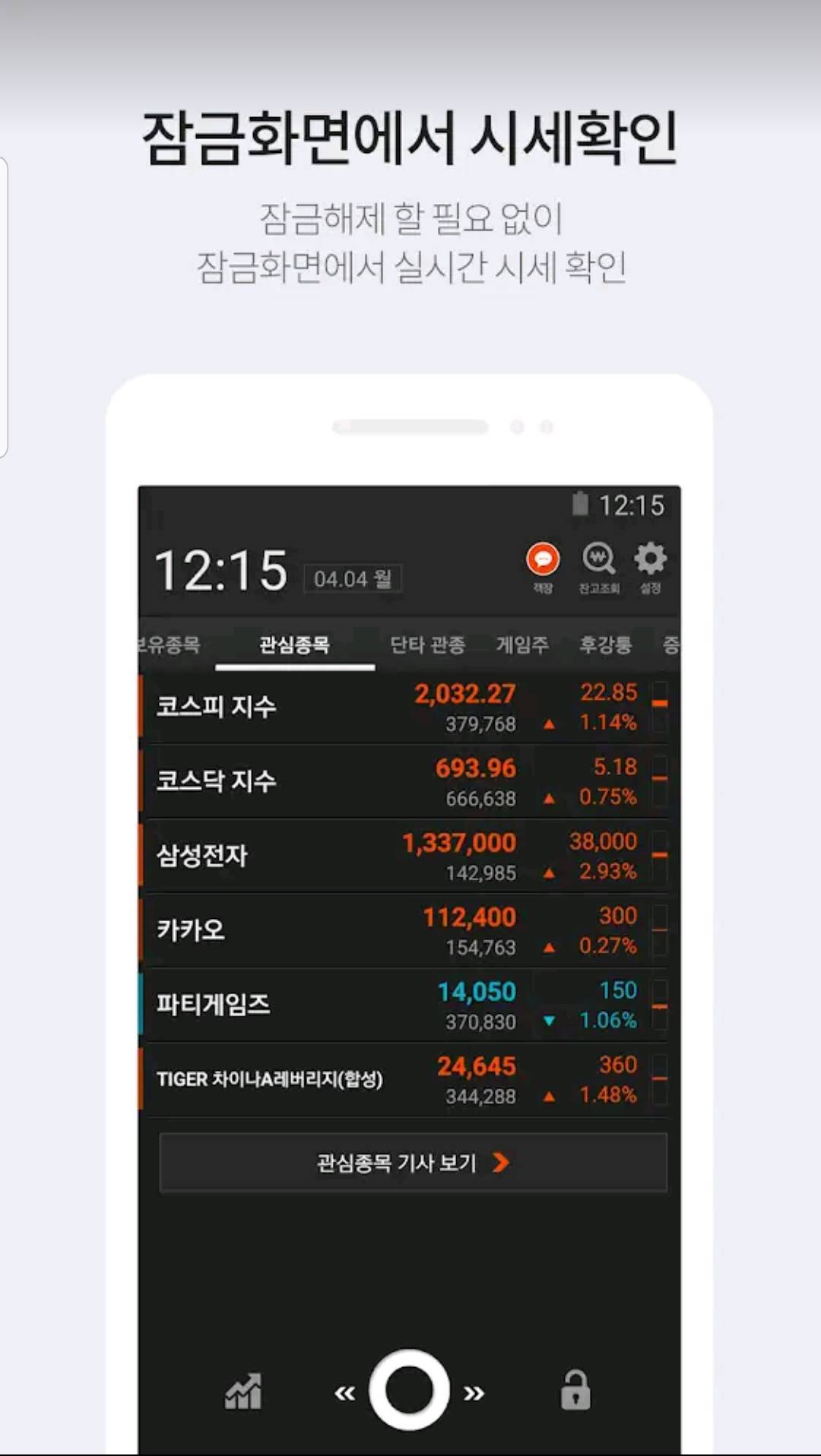 그 외에도 내가 관심있는 종목에 대한 최신 뉴스기사들을 보여주는데 주식투자시 실시간 호재, 악재가 나오게 되면 빠른 매매를 해야된다는 점에서 큰 도움을 받을 수 있습니다. 그 외에도 스마트폰의 잠금화면에서 바로 사용할 수 있는 핵심적인 기능들을 설정할 수 있는데 관심종목, 내 잔고, 뉴스기사등을 바로 확인할 수 있습니다.