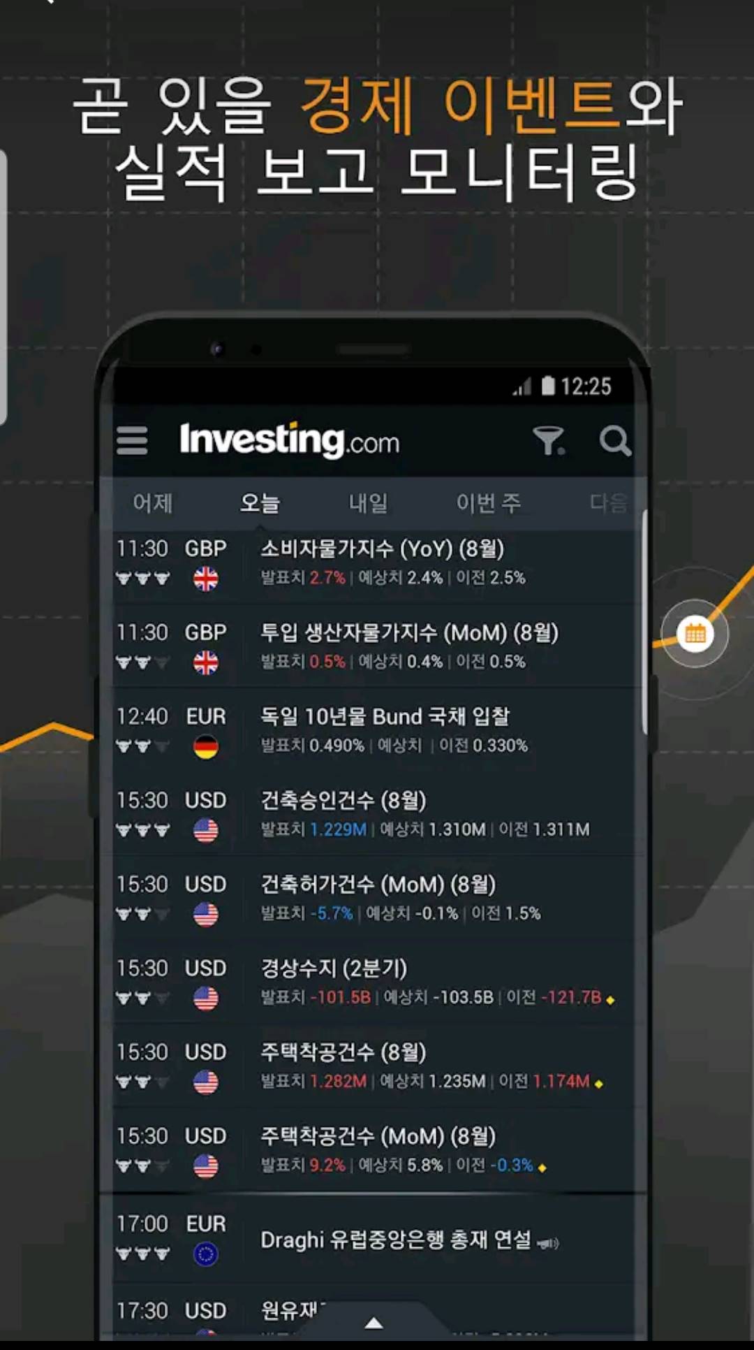 투자하고자 하는 종목에 대한 디테일한 자료와 정보들을 정리해서 볼 수 있으며 저도 투자에 앞서서 인베스팅 어플로 정보를 가장 먼저 읽어볼 정도로 자신있게 추천할 수 있습니다. 그리고 가장 중요한 전세계적인 경제 이벤트의 일정을 확인할 수 있는데요. 대표적으로 미국의 실업자지수나 원유 재고량 발표로 주식시장이 요동친다는 이야기는 들어보신 적이 있으실 겁니다.