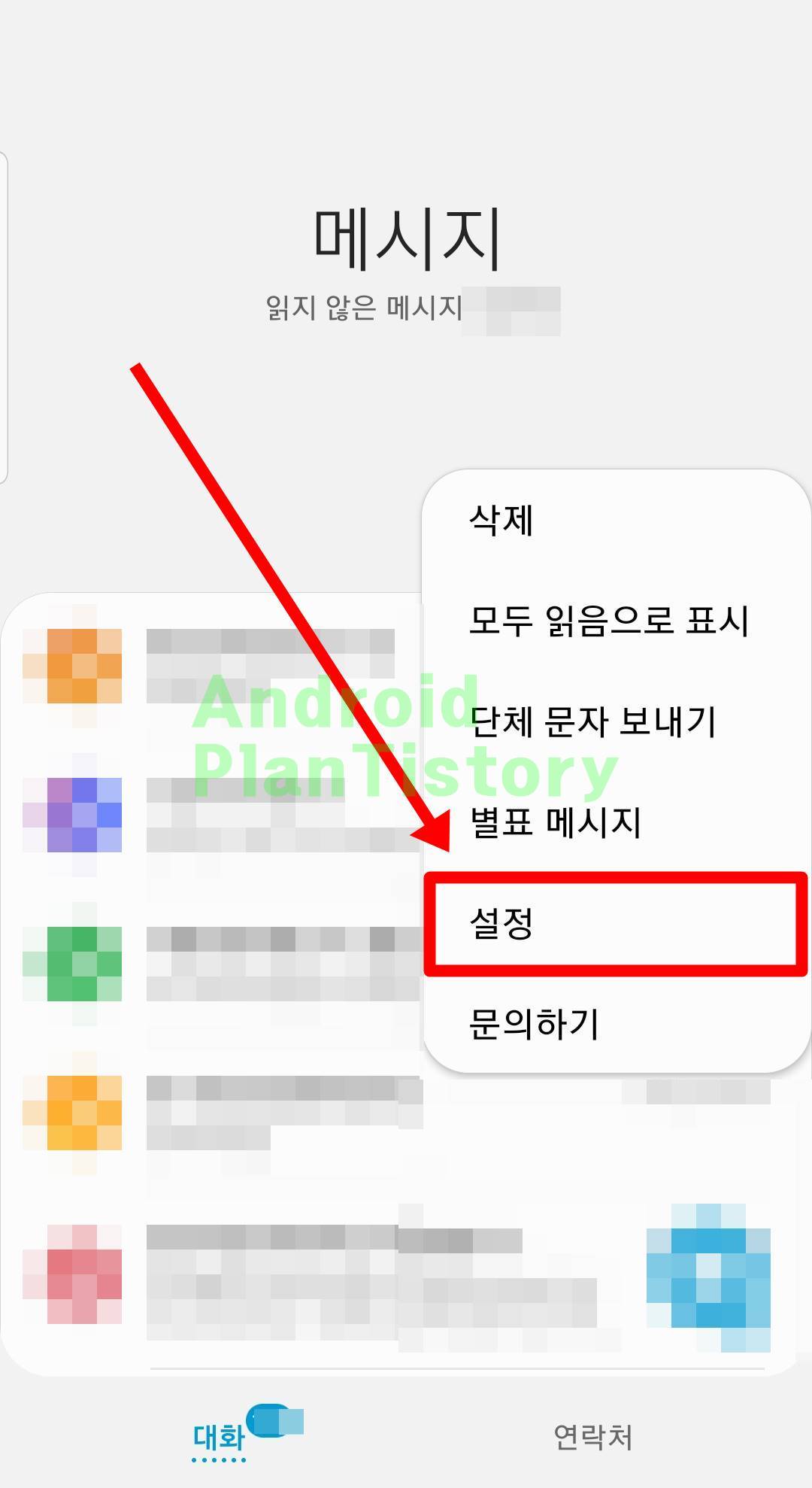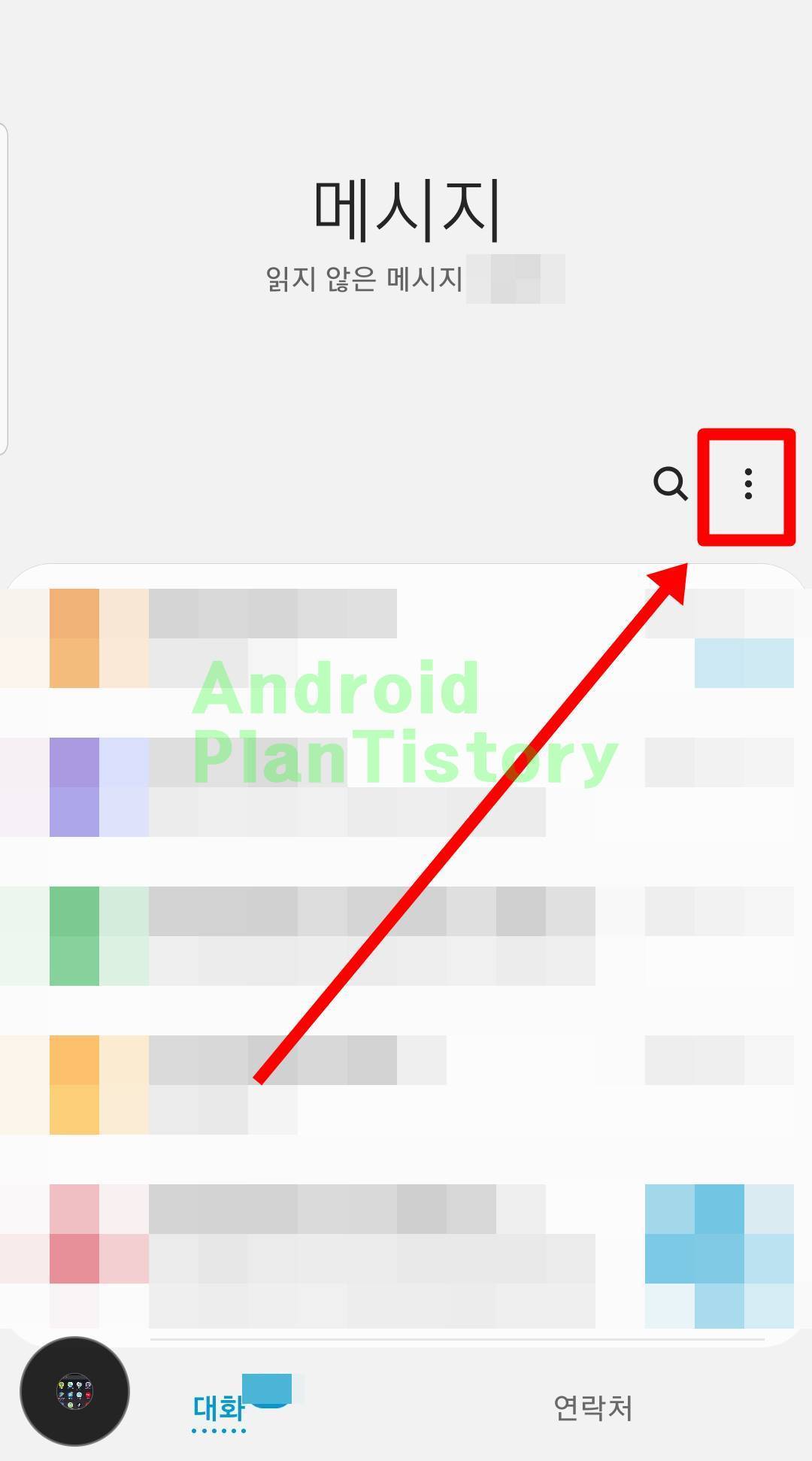 스마트폰에서 메시지 앱을 찾아서 클릭해주세요. 메시지 목록이 보이는데 우측 상단을 보시면 ... 메뉴 버튼을 찾아서 눌러 들어가시면 됩니다.